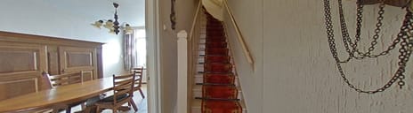 Bij binnenkomst betreedt u de lange hal met een garderobe, hoog plafond en de trapopgang naar de 1e verdieping.