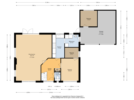Indeling begane grond: entree/hal, werk-/slaapkamer (ca. 11 m²) met toegang tot multifunctionele ruimte (geschikt als badkamer), toiletruimte, meterkast, ruime en lichte L-vormige woonkamer (ca. 39 m²), keuken (8 m²) met nette keukenopstelling voorzien van diverse inbouwapparatuur, bijkeuken met toegang tot de garage waarin een werkruimte is gemaakte (ook geschikt als dubbele garage);