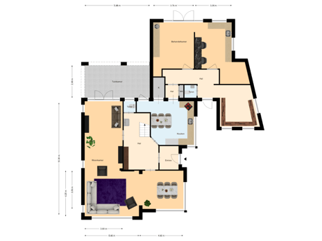 Je betreedt de woning via de voordeur, waar je in de vestibule de garderobenis aantreft. Via de openslaande deuren lopen we door naar een royale hal met toiletruimte, bordestrap en toegang tot de woonkamer en woonkeuken. De L-vormige woonkamer beschikt over openslaande tuindeuren naar het overdekte terras, voorzien van een elektrisch zonnescherm. De woonkeuken is voorzien van een combimagnetron, oven, inductiekookplaat, koelkast, vaatwasser en beschikt naast vloerverwarming ook over comfortabele plintverwarming. Via de keuken is de royale kelder te bereiken, met een separate ruimte die beschikt over de omvormer voor de PV panelen en de waterontharder. Vanuit de keuken is er een doorloop via een portaal naar de praktijkruimte, die beschikt over een keukenblok en is voorzien van een airco die zowel kan koelen als verwarmen. Vanaf de wachtkamer heb je toegang tot de toiletruimte en de royale oprit.