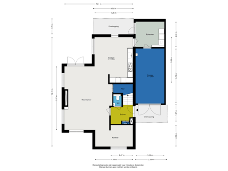 Via de voordeur loop je de hal binnen met de meterkast, het toilet en de trapopgang naar de verdieping. De woonkamer is royaal opgezet met een grote zithoek rondom de haard. Aan de voorzijde is een kantoorruimte gerealiseerd: ideaal voor het thuiswerken of studeren. De woonkeuken bevindt zich aan de achterzijde. De keuken is in een hoek opgesteld en voorzien van de nodige bergruimte en divers inbouwapparatuur. De praktische bijkeuken is vanaf de keuken bereikbaar. Een ruimte die zich uitstekend leent als berging en de wasapparatuur. De garage is van binnenuit bereikbaar.