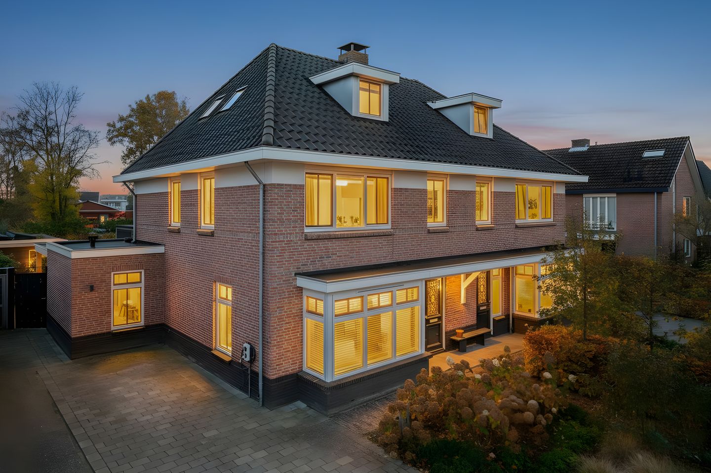 Je loopt de ruime woonkeuken binnen en meteen valt het licht op dat door de openslaande tuindeuren naar binnen stroomt. Het is zo’n plek waar je zonder moeite de hele avond blijft zitten, aan een grote tafel, met vrienden of met het gezin. De keuken is luxe uitgevoerd, met onder andere een stoomoven, combi-oven, een inductiekookplaat, afzuigkap, kokendwaterkraan, vaatwasser en koelkast. Alles bij de hand, alles netjes afgewerkt. Via de ensuite deuren bereik je de woonkamer aan de voorzijde. Hier zorgen de sfeervolle erker en de inbouwspots voor een knusse, fijne zithoek waar je na een drukke dag lekker kunt landen. Op de begane grond is bovendien een bijkeuken met een vaste kastenwand en aansluitingen voor de wasapparatuur. De tuin verdient een eigen hoofdstuk: diep, groen en met volop privacy. Hier kun je buiten leven zoals je dat wilt: van ontspannen loungen tot uitgebreid koken onder de veranda. De houten berging biedt ruimte voor opslag en de tuin heeft een levendige charme, met kleine details die het buitengevoel compleet maken.