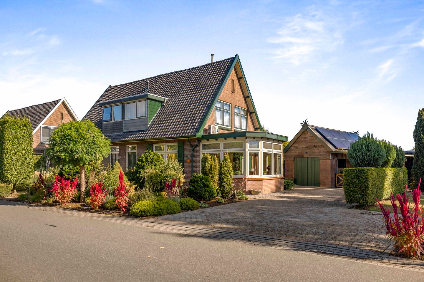 Voor wie graag de handen uit de mouwen steekt of veel bergruimte nodig heeft, is de grote stenen garage een uitkomst. Deze is voorzien van een veranda en een praktische vliering. Daarnaast beschikt het perceel over een houten tuinhuis met overkapping, perfect voor hobby, opslag of een sfeervolle loungehoek. Op de oprit is plek voor meerdere auto’s.