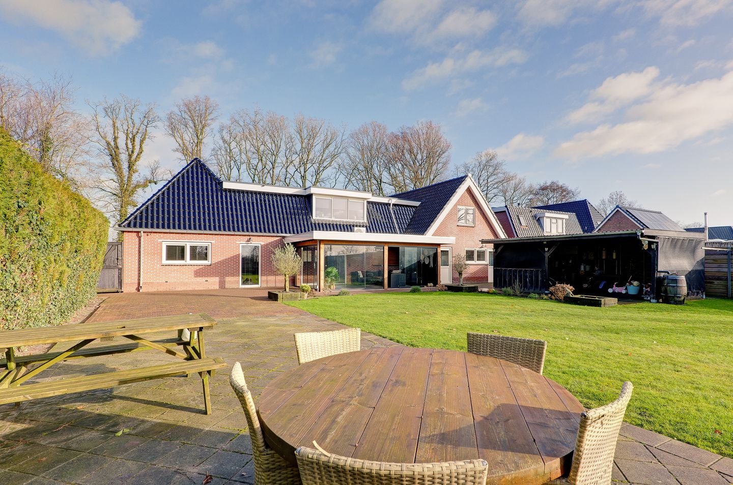 De begane grond is ruim opgezet met een lichte woonkeuken van circa 40 m², voorzien van grote raampartijen die zorgen voor veel natuurlijk licht. Deze ruimte is in 2022 compleet vernieuwd. De keuken is van alle gemakken voorzien en biedt door de speelse indeling van deze ruimte voldoende plek voor een riante eettafel. Grenzend aan de keuken is een knusse zithoek gecreëerd. De gehele woonkeuken is voorzien van vloerverwarming. Vanuit de woonkeuken geeft een schuifpui toegang tot de recent gebouwde riante overkapping, waar je tot laat in het jaar heerlijk kunt verblijven dankzij de glazen panelen die de overkapping eenvoudig afsluiten. Via de hal naast de keuken is de bijkeuken bereikbaar. Ook deze is ruim en beschikt over aansluitingen voor het witgoed. De inpandige garage en naastgelegen berging bieden opslagruimte in overvloed.