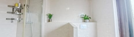 The spacious and neat bathroom was renovated in 2018 and finished with modern tiles. This room is equipped with a floating toilet, vanity unit with sink and a walk-in shower.