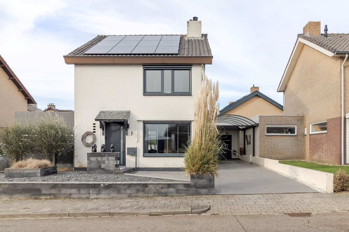 De voortuin is verzorgd aangelegd met een combinatie van grind en een stijlvolle bloembak, beplant met siergras en twee prachtige olijfbomen.