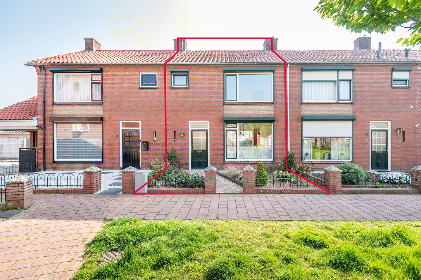 De voortuin is netjes aangelegd met sierbestrating en beplanting en biedt een verzorgde aanblik. Via een pad bereik je de voordeur.