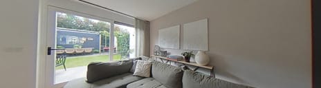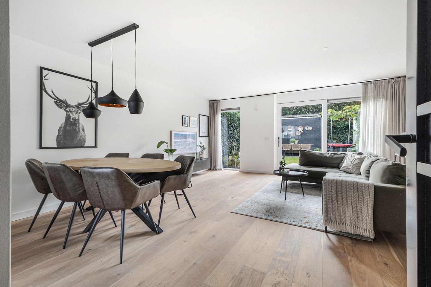 Je komt binnen in de hal met trapopgang, meterkast en luxe toilet. De zwarte stalen deur geeft toegang tot de lichte woonkamer met houten vloer, strakke wanden en schuifpui naar de tuin.