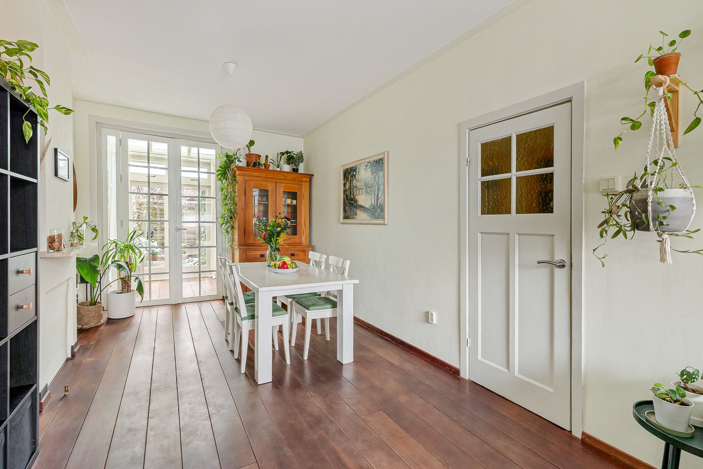 De woonkamer is ruim en licht, met grote ramen en een robuuste houten vloer. Hier ontstaat vanzelf dat fijne gevoel van thuiskomen. Een plek waar je met een boek op de bank zit, waar vrienden aanschuiven aan de eettafel en waar de dag rustig eindigt. De serre aan de achterzijde is een verlengstuk van het huis én van de tuin. Een lichte ruimte met glazen dak en openslaande deuren. Ideaal als werkplek, atelier of gewoon als plek om je terug te trekken met uitzicht op het groen. Hier voel je de seizoenen, zonder dat je buiten hoeft te zijn.