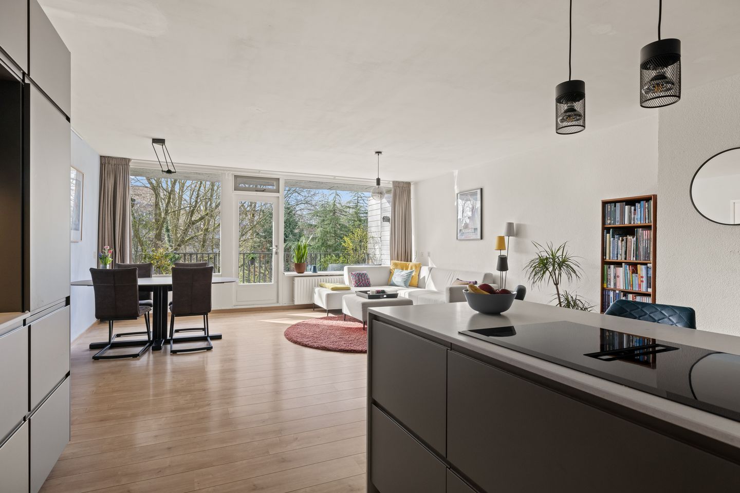 Dankzij de ligging aan de achterzijde van het complex, biedt de woonkamer een groen uitzicht. Vanaf de bank geniet je ’s ochtends in alle rust van het groen, de vogels die fluiten of een eekhoorntje die zijn weg zoekt tussen de hoge bomen. Vanuit de woonkamer stap je direct het balkon op. Hier zit je op zomerse dagen vrijwel de hele dag lekker in de zon. Een groot zonnescherm maakt dat je op warme dagen ook in de schaduw van je balkon kunt genieten.