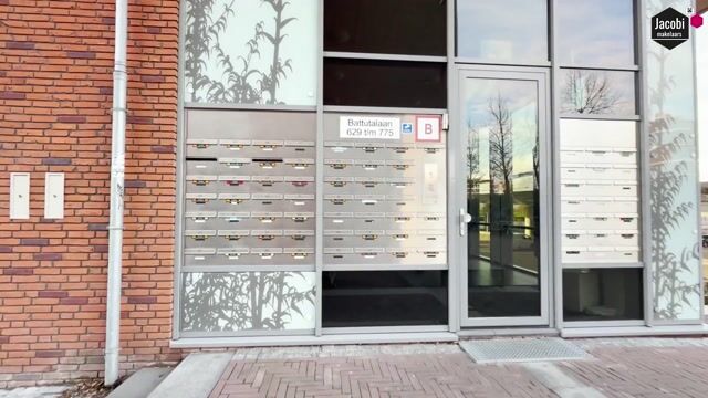 De gemeenschappelijke entree is netjes afgewerkt met brievenbussen, bellentableau en een royale hal met trap en lift.