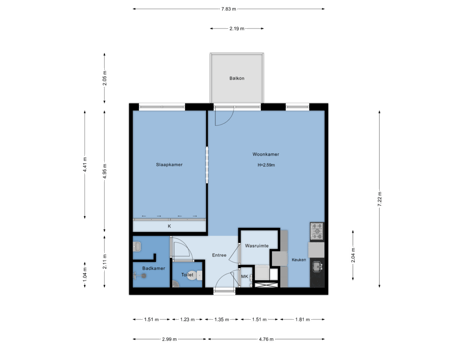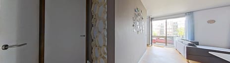 Op de tweede verdieping vind je de entree van de woning. Je komt binnen in de hal waar je toegang hebt tot alle ruimtes zoals; toilet, bergkast met witgoedaansluiting, badkamer en de woonkamer met open keuken en slaapkamer.