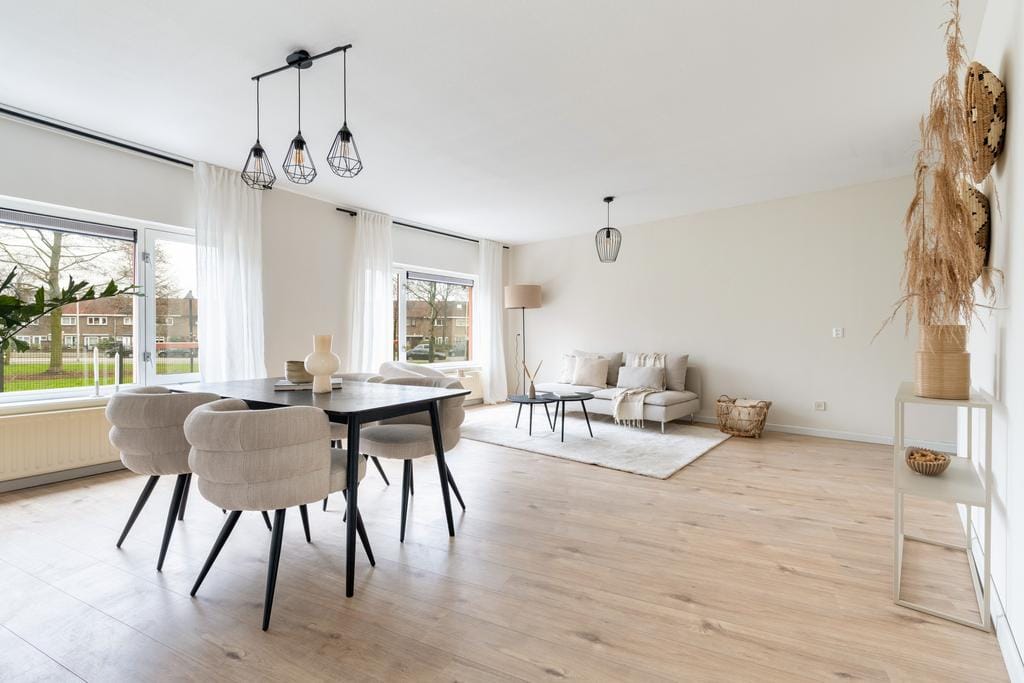 De woonkamer is een heerlijke leefruimte met grote raampartijen aan beide zijden, waardoor het daglicht mooi naar binnen stroomt. Het vrije uitzicht over een brede groenstrook zorgt voor een ruimtelijk en ontspannen gevoel.