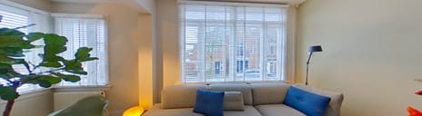 De woonkamer en suite is licht en ruim en voorzien van een PVC visgraatvloer, vaste kasten en twee zwarte marmeren schouwen. De ruimtes zijn groot genoeg voor een grote eettafel en lekkere zithoek. De op maat gemaakte (boeken)kasten geven de ruimte nog meer sfeer en vanuit de erker kijk je over het groen aan het eind van de straat.