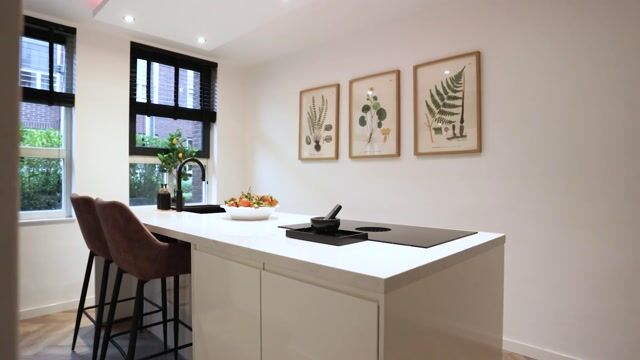 At the front of the home is the stylish living kitchen, finished to a high standard and designed with great attention to detail. The kitchen features a striking herringbone floor, a generous cooking and sink island, and an appliance wall. It is fully equipped with a refrigerator, freezer, steam oven, combi oven, dishwasher, Quooker, and Bora induction cooktop. High-gloss white cabinetry and a light composite worktop complete the modern look.