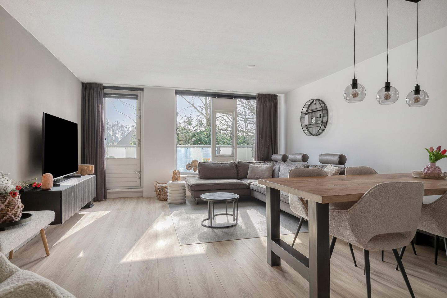 De woonkamer voelt direct licht en ruim aan. Dankzij de grote raampartijen en de gunstige ligging op het zuiden stroomt het daglicht hier rijkelijk naar binnen. Vanuit de zithoek kijk je vrij weg over het groen, wat zorgt voor een prettig en open gevoel. De ruimte is sfeervol afgewerkt met een lichte eiken laminaatvloer (2022) en strak afgewerkte wanden (2023), waardoor het geheel modern en verzorgd oogt. Ook biedt de ruimte voldoende plek voor een gezellige eettafel, waardoor je hier moeiteloos een fijne woon- én eetruimte creëert, perfect voor lange diners of een snelle maaltijd doordeweeks.