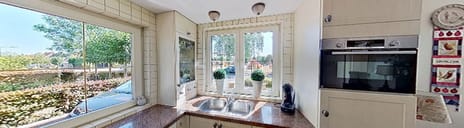 Aan de voorzijde tref je de compleet uitgeruste keuken. Deze is voorzien van onder andere een vaatwasser, 5-pits inductiekookplaat met afzuigkap, koelkast en een combi-oven. De ramen beschikken over elektrische rolluiken voor een aangename temperatuur tijdens warme zomerdagen.