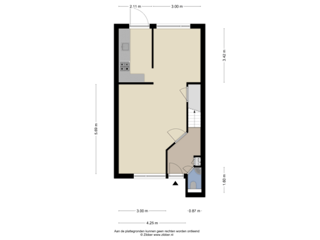 Begane grond: In de hal is er een deur naar het toilet met een fonteintje en een deur naar de meterkast. De trap geeft toegang tot de eerste verdieping. De Z-vormige woonkamer heeft een zithoek aan de voorzijde met een levendig uitzicht op de straat. De eethoek ligt aan de tuinzijde. De dichte keuken heeft een rechte keukenopstelling voorzien van een inductie kookplaat, een afzuigkap, een koelkast, een combi-magnetron en een vaatwasser.