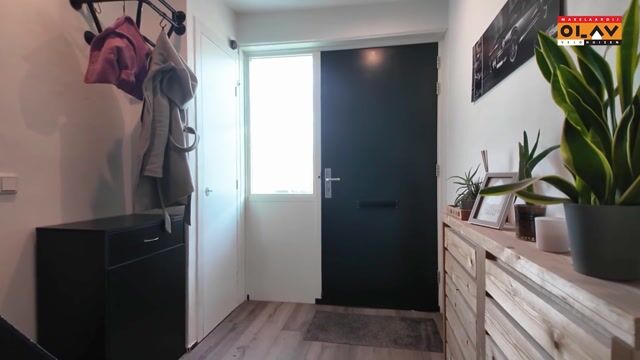 Via het looppad in de verzorgde voortuin bereikt u de entree van de woning. De hal biedt toegang tot de meterkast, de toiletruimte en de woonkamer. De afwerking is modern en strak, wat direct een verzorgde eerste indruk geeft.
