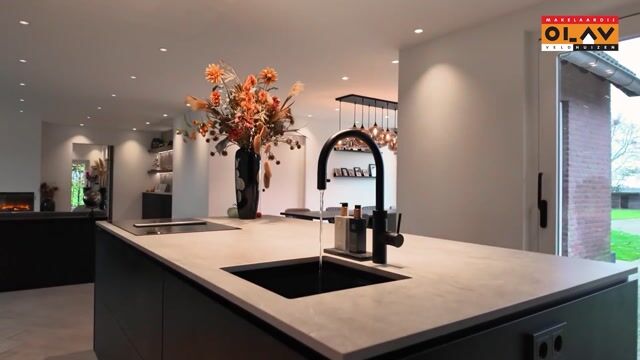 De moderne open keuken vormt het hart van de woning. Uitgevoerd in een eigentijdse, donkere kleurstelling met een groot kookeiland en hoogwaardige inbouwapparatuur. De keuken is voorzien van een inductiekookplaat met geïntegreerde afzuiging, twee ovens, koelkast, vriezer en een Quooker. Dankzij de ruime opzet en de verbinding met de eethoek is dit een perfecte plek voor uitgebreid koken en gezellig tafelen met uitzicht op de achtertuin. Bovendien heeft u vanuit zowel de keuken als de eetkamer direct toegang tot de achtertuin via de schuifdeuren.