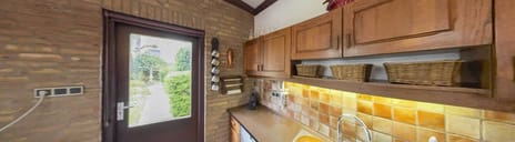 Via de eetkamer bereikt u de tuin middels een praktische schuifpui. Aansluitend is de keuken bereikbaar, afgesloten met een karakteristieke harmonicadeur. De keuken is functioneel ingericht met een tegelvloer, spoelbak, vaatwasser, oven, elektrisch fornuis, afzuigkap en koelkast. Ook is er een aansluiting voor witgoed aanwezig. Vanuit de keuken is eveneens toegang tot de tuin.