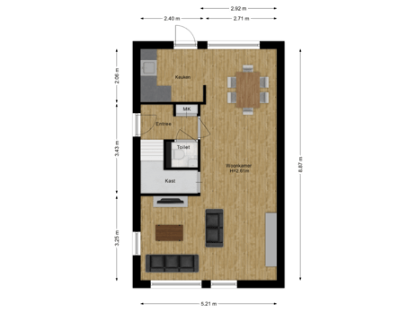 De hal geeft toegang tot de ruime L-vormige woonkamer, die zich over de volledige diepte van de woning uitstrekt. Door de grote raampartijen aan de voor- en zijkant is er veel natuurlijke lichtinval. Er is voldoende ruimte voor zowel een comfortabele zithoek aan de voorzijde van de woning, alsmede een royale eethoek bij de keuken. Daarbij is er een praktische bergkast voor voorraad, stofzuiger of keukenapparatuur die niet dagelijks wordt gebruikt.