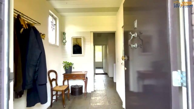 The large kitchen benefits from abundant natural light thanks to three steel-framed double-glazed windows, which also provide a pleasant view of the front garden. The space is finished with a slate floor, wooden ceiling and exposed brick walls. The kitchen is laid out in a practical L-shape in light, neutral tones and offers ample storage in drawers and wall and base cabinets. A granite countertop and aluminium backsplash add a modern touch. It is equipped with a sink with mixer tap and several built-in appliances, including a ceramic hob, stainless steel extractor hood and dishwasher. An additional cabinet wall houses a refrigerator, convection oven and steam oven. The generous size easily accommodates a large dining table.