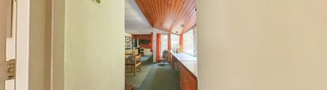 The spacious living room is the heart of the house. Thanks to a substantial extension on the left-hand side, you can enjoy a beautiful space with wooden parquet flooring, a high ceiling up to the ridge of the roof, and large windows offering a magnificent view of the garden. The original living room has a cozy fireplace and sliding doors to the garden. The extension adds a cozy wood-burning stove and an extra door to the outside.