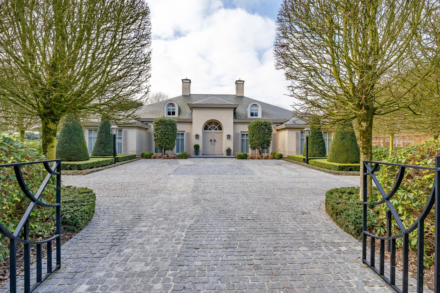 De tuinverharding is stijlvol uitgevoerd met natuurstenen klinkers en strak gesnoeide, geometrische vakken. Discreet aan de rechterzijde ligt een ruime gastenparkeergelegenheid met aansluitend een zijtuin richting de achtertuin. De achtertuin biedt, net als de voor- en zijtuinen, optimale privacy dankzij een metershoge haag en hoogstam leibomen die samen één groen scherm vormen. Ronde lijnen in borders en snoeivormen versterken het parkachtige karakter. Met een beregeningsinstallatie op grondwater, uitgebreide tuinverlichting en middels een satelliet aangestuurde maairobot blijft het geheel in topconditie.