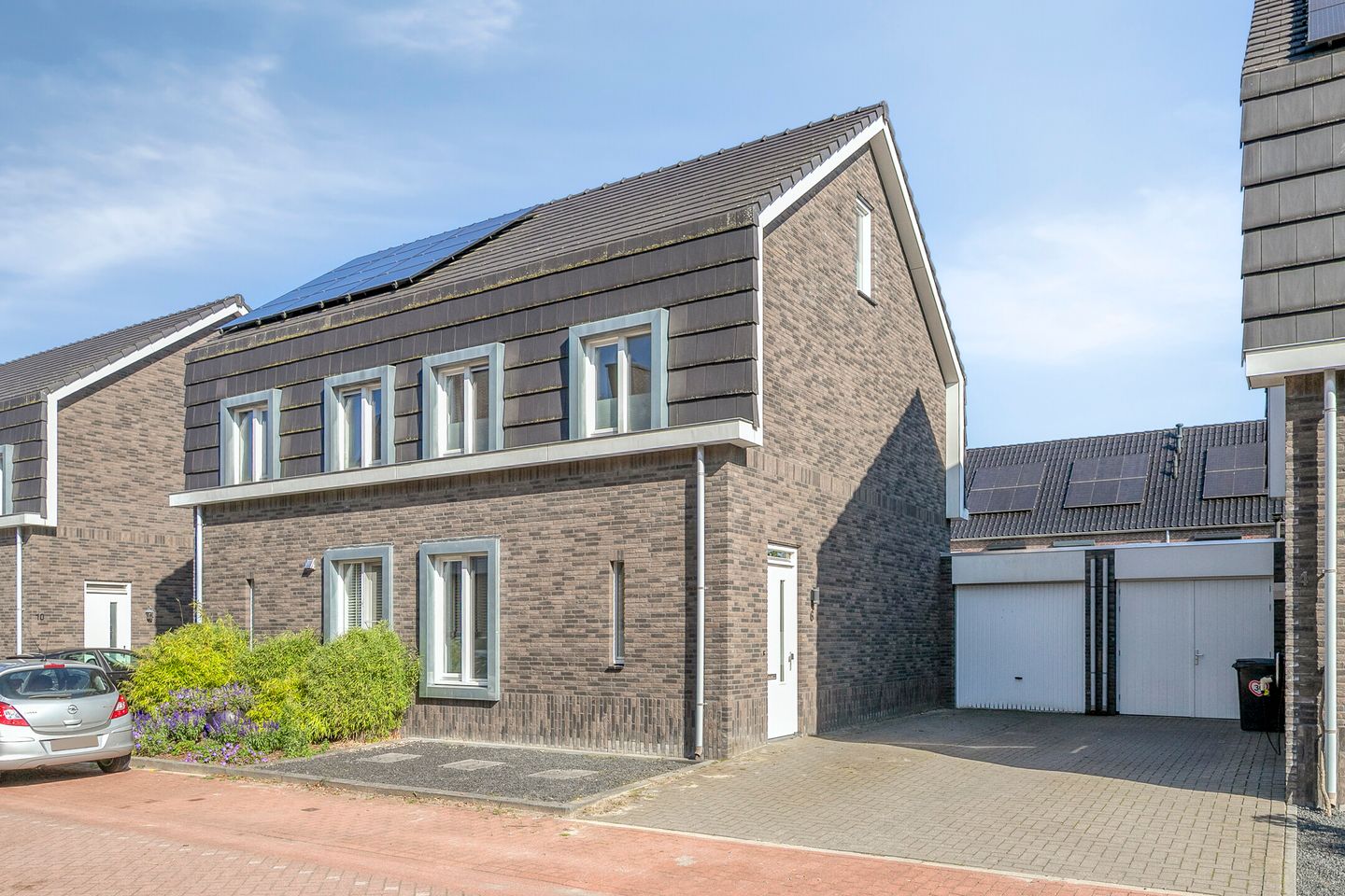 De voortuin is onderhoudsarm aangelegd met siergrind. Naast de woning ligt de oprit naar de garage. De garage is bereikbaar via een kanteldeur aan de voorzijde en een loopdeur vanuit de achtertuin.