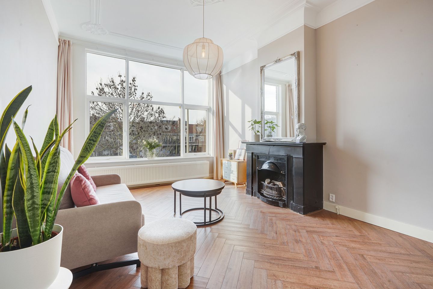 Lichte woon/eetkamer van cira 44 m2 voorzien van prachtige originele suite deuren met diep zand geëtst glas, uitgevoerd in twee luxueuze Art Nouveau/Art Deco motieven, waarmee u de living en eetkamer kunt scheiden. Verder is de woon/eetkamer voorzien van een zware kwaliteit PVC-vloer in visgraatmotief, hoge plafonds met de originele ornamenten, 2 antieke schouwen, vrij uitzicht aan de voorzijde en via de achterkamer middels openslaande deuren toegang tot het 1e achterbalkon, gelegen op het noordoosten, voorzien van een markies.