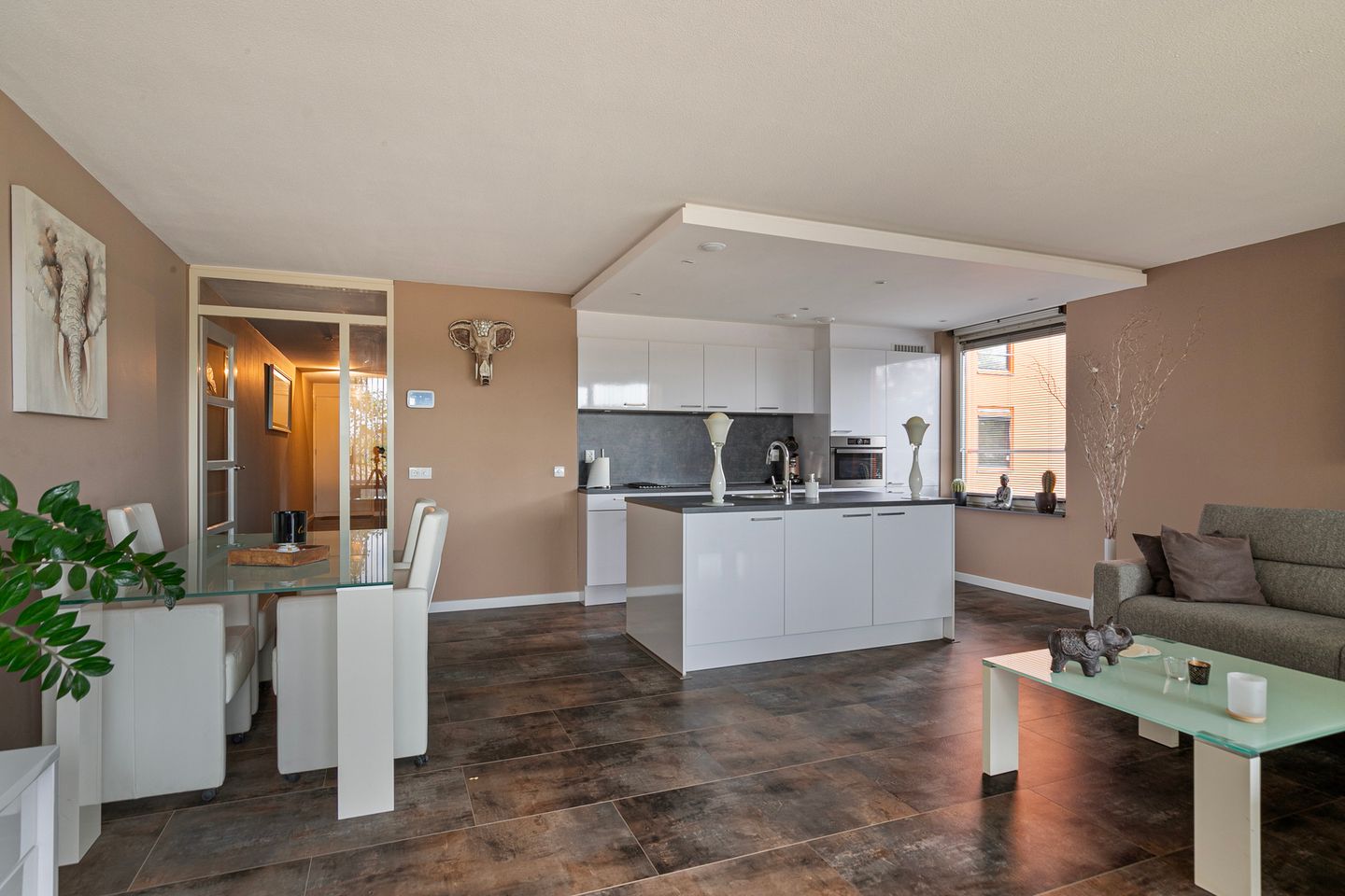 Entrance hall with meter cupboard and videophone. Door with glass insert to the spacious living room consisting of an open kitchen in straight and island arrangement and a spacious living room with sliding doors to the sunny terrace. In high summer days there is from about noon until sunset sun on the terrace. The white kitchen with dark countertops is equipped with a Bora hob with integrated extractor hood, combination oven, refrigerator/freezer. The island is equipped with a sink and a dishwasher. The living room is a nice open space with an additional side window and lots of light through the large sliding doors. The master bedroom is a fine spacious room and from this room the storage room is accessible. In the storage room are the connections for the washer and dryer, mechanical ventilation unit and central heating boiler. In the storage room are floor tiles and there is a window. Bedroom II is currently used as a work/study room, which is also of a generous size. The bathroom is fully tiled in white / gray color scheme, here are a shower, radiator, washbasin and mirror with lighting available. The separate toilet is tiled in the same color scheme and equipped with a wall closet and sink. In the bathroom and toilet, the light goes on (and off) automatically via a sensor. The house, except for the wet rooms, has PVC tiles which are laid without thresholds.