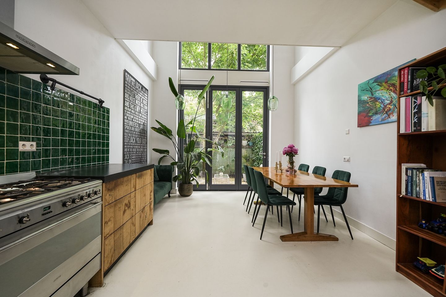 De stijlvolle woonkeuken vormt het kloppend hart van het huis: een plek om te koken, samen te komen en te genieten. De hoge achterpui met veel glas die doorloopt doordat er op de eerste verdieping een vide is, zorgt voor prachtig lichtinval in de gehele kamer. Dit in combinatie met de strak gestucte wanden en de strakke lichte vloer geeft een gevoel van ruimte.