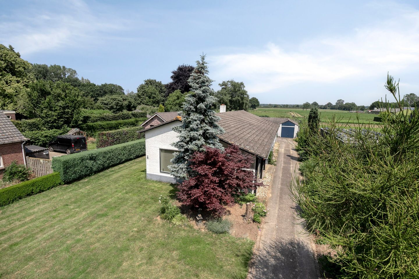 Aan de rechterzijde van de woning bevindt zich een royale oprit die volledig langs de woning doorloopt. Parkeren op eigen terrein is hier dan ook ruim voldoende mogelijk.