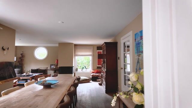 Entrance hall, meter cupboard, and toilet with washbasin. From the hall, you can access the TV room, kitchen-diner, and living room. The living room features a fireplace (visible from all areas), a sitting area, and a dining area. French doors lead to the garden and to the kitchen-diner. The kitchen-diner boasts a generous island with an induction hob and integrated extractor, plenty of drawers, worktop space, and a cosy bar. Facing the garden is a long work surface and a workspace. The tall cupboard wall houses a steam oven and combination microwave by Whirlpool, an American-style fridge, and a coffee bar. From both the kitchen and the internal storage room, you reach the utility room, which has connections for a washing machine and dryer, a sink, and ample storage. The kitchen also has French doors opening onto the garden.