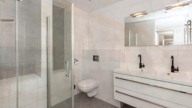 Ruime overloop met een grote schuifkast. Ruime badkamer met moderne betegeling en voorzien van een breed meubel met een dubbele wastafel, douche met een glazen scherm en handige nisjes, een design radiator en een 2e toilet. Het plafond is voorzien van spots.