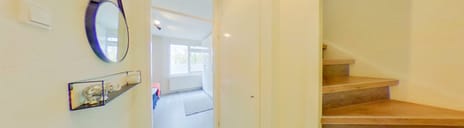 Kom binnen in de ruime hal met trapkast. Hier bevindt zich ook direct slaapkamer I met genoeg ruimte voor een kingsize bed en voldoende ruimte voor je kleren en met spachtelputz wandafwerking.