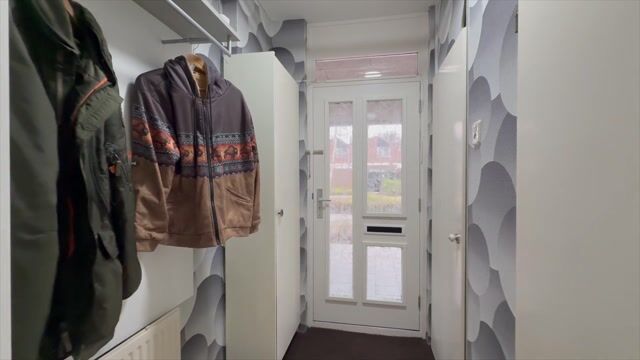 Entree woning onder luifel, ruime ontvangsthal voorzien van garderoberuimte, meterkast en vaste kast met opstelling cv-combiketel.