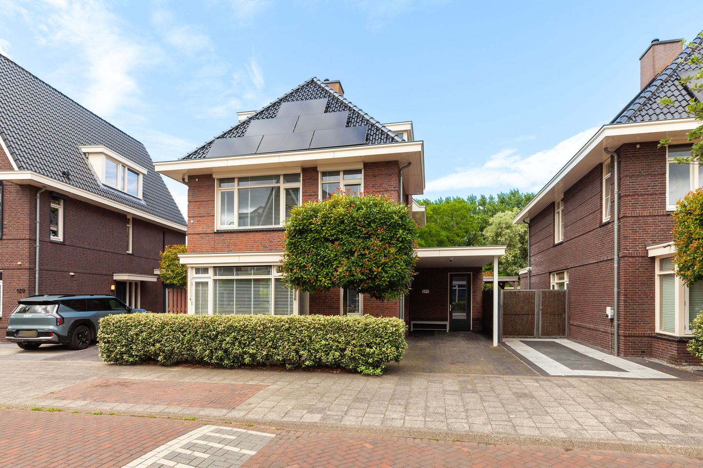 Via de mooi aangelegde voortuin en oprit bereik je de carport en de extra fietsenberging aan de voorzijde. Hier kan je de auto parkeren. De 2e parkeerplaats vind je aan de andere kant van het huis.