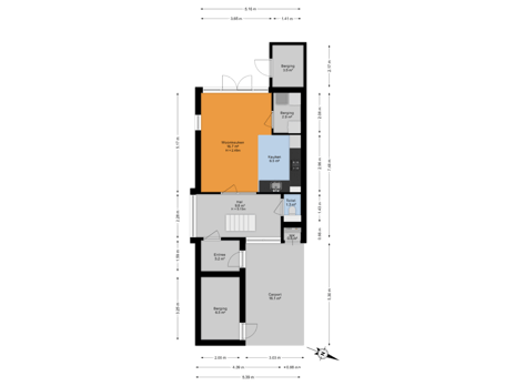 Bij binnenkomst kom je in de hal met toilet, waarna je doorloopt naar de royale woonkeuken. De keuken is voorzien van diverse inbouwapparatuur. De aparte berging heeft een aansluiting voor de wasmachine. Via de dubbele openslaande deuren aan de achterzijde kom je in de achtertuin, die rustig ligt aan een singel met achtergelegen groen. De berging aan het terras biedt extra opslagruimte.