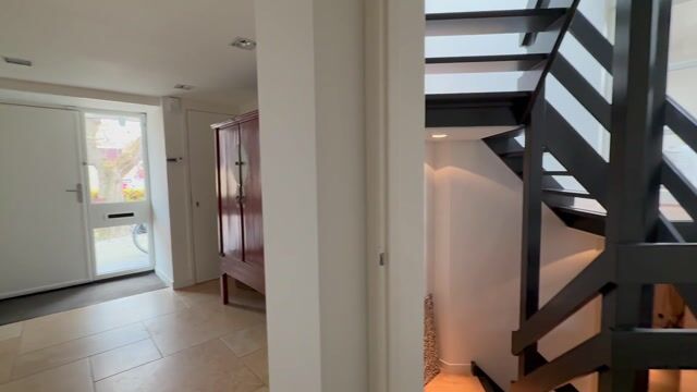 De overloop met de trapopgangen is de verbinding met de woonkamer en de verhoogde zitkamer. Daarnaast zorgt het voor een toegang tot de verdieping en het souterrain. De plafond zijn voorzien van inbouw spots, de wanden zijn glad afgewerkt en er ligt een houten vloer.