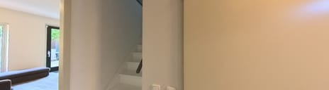 Na de trapopgang is er toegang tot de overloop. Hier zijn de wanden gesausd en ligt er een PVC vloer, die is doorgetrokken naar de drie slaapkamers op deze verdieping. Naast dat de overloop toegang biedt tot de drie slaapkamers, is er ook een trap naar de 2e verdieping en is er toegang tot de badkamer.