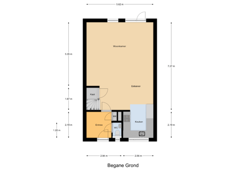 Bij binnenkomst via de voordeur stap je in een ruime entreehal met toegang tot de meterkast, het toilet en de woonkamer. De woonkamer is heerlijk licht dankzij de grote raampartijen en de lichte vloerafwerking. Er is voldoende plek voor een gezellige zithoek en een royale eettafel. Een praktische trapkast biedt extra bergruimte en via een deur bereik je de achtertuin. Aangrenzend aan de woonkamer bevindt zich de keuken. Deze keuken is voorzien van diverse inbouwapparatuur, waaronder een elektrische kookplaats, combi-oven, vaatwasser, koelkast en vriezer.
