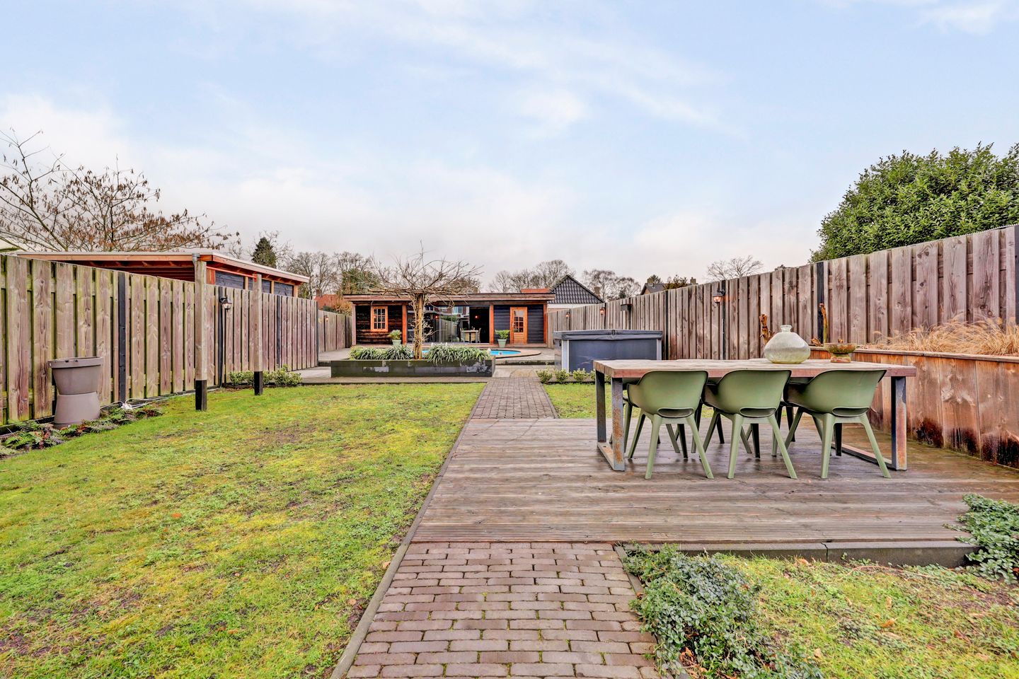 De tuin is zonder twijfel één van de absolute hoogtepunten van deze woning. Het perceel is uitzonderlijk diep en fraai aangelegd met een combinatie van gazon, bestrating en houten terrassen. Direct aan de woning bevindt zich het terras, gevolgd door een ruim grasgedeelte dat zorgt voor een open en groene uitstraling. In de tuin bevindt zich het zwembad, wat zorgt voor een ultiem vakantiegevoel in eigen achtertuin. Links in de tuin staat een kleinere berging voor extra opslag. Achterin de tuin treft u de royale tuinkamer, waar u het hele jaar door comfortabel kunt zitten. Aansluitend bevindt zich nog een extra berging. Door de diepte van het perceel, de slimme indeling en de volwassen erfafscheidingen geniet u hier van maximale privacy. Dit is buitenleven op hoog niveau.