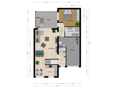 Voortuin met oprit. Entree/hal met tegelvloer, meterkast en half betegelde toiletruimte met toilet en fonteintje. Woonkamer met tegelvloer, schoon metselwerk/behang, trapkast en grote raampartij richting de tuinkamer. Aan de voorzijde ligt de nette L-vormige keukenopstelling met 4-pits gasfornuis, afzuigkap, koelkast en oven/magnetron. Woonkamer en keuken zijn samen ca. 41 m2 groot. Via de tussenhal is er toegang tot de eerste slaapkamer (ca. 14 m2) met laminaatvloer en behang en ook de volledig betegelde badkamer (ca. 6 m2) met ligbad, inloopdouche, toilet en modern wastafelmeubel. Tevens is inpandig toegang tot de garage (ca. 19,5 m2) met betonvloer, elektrische sectionaalpoort, Vaillant combiketel (eigendom), mechanische ventilatie unit en witgoedaansluitingen. Direct grenzend aan de tussenhal ligt de fijne tuinkamer/serre (ca. 16 m2) met aluminium overkapping, laminaatvloer en schuifwanden richting tuin. De tuin, welke op het oosten is gesitueerd, is grotendeels betegeld/voorzien van kiezel, beschikt over een tuinhuis en diverse aanplant en tevens een poortje om achterom te komen.