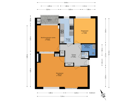 Wanneer u het appartement binnenstapt, arriveert u in de ruime hal van 8,3 m². Vanuit deze centrale ruimte heeft u toegang tot vrijwel alle vertrekken. In de hal zitten 2 vaste kasten met voldoende bergruimte.