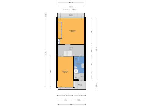 Aan de achterzijde gelegen (vergrootte) slaapkamer van 5.42 bij 2.81 meter. Moderne badkamer met inloopdouche, wastafel, tweede toilet en doorloop naar separate ruimte met opstelling wasmachine en droger. Balkon aan de achterzijde van ca. 4 m2.