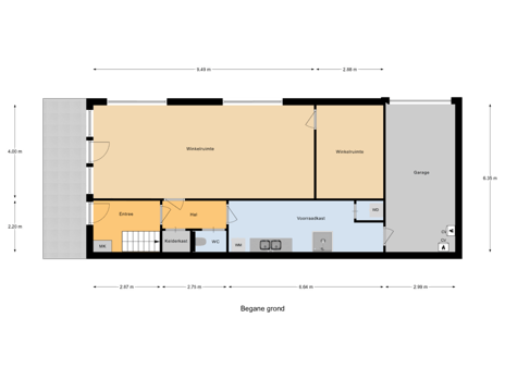 The entrance features a meter cupboard and staircase with stairlift to the upper apartment. At the front is the retail space, currently fitted out as a hair salon. At the rear, a separate room is set up as a beauty salon. Additionally, the tenant rents the basement cupboard and toilet, accessible via the hallway. Through the same hallway, the resident can access the integrated garage, which includes a storage cupboard with pantry, shower cabin, and connections for a washing machine and dryer.