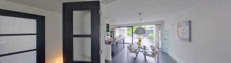 Grenzend aan de keuken vindt u de sfeervolle woonkamer. De hoekramen zorgen voor veel daglicht en zijn voorzien van stijlvolle shutters waarmee u eenvoudig de gewenste lichtinval regelt.