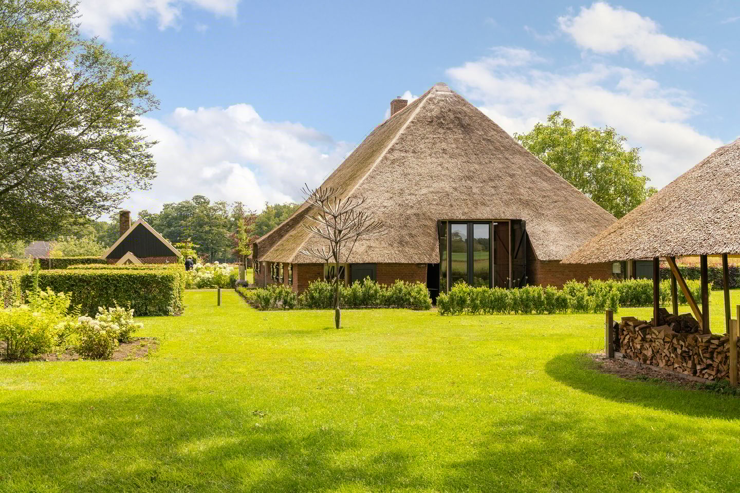 Waar u ook kijkt, treft u een perfecte staat van onderhoud. Misschien herkent u de signatuur van het befaamde Maas Architectenbureau uit Lochem. Esthetiek en authenticiteit of historie en modern comfort gaan hand in hand. De voormalige, zelfstandige voorzienende, doorrijschuur met whitewash gebinten, ligt het dichts aan de weg. Dankzij de nieuwe stalen deuren is het nog steeds een ‘drive through’. De grote woonboerderij combineert wonen met een stijlvol ontvangstgedeelte. Die laatste is ruimtelijk, haast transparant ontworpen met nauwelijks deuren, een open trap, vide en gedurfde doorkijkjes. Het voorhuis met royale raampartijen kijkt ver weg over de achtergelegen landerijen. De imposante schouw vormt een sfeervol decor met antieke tegels voor de design houtkachel van Dick Geurts.