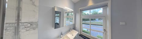 De badkamer is modern uitgevoerd en uitgerust met een inloopdouche, een dubbele wastafel en een designradiator gecombineerd met plafondverwarming (infraroodpaneel). Aan de overloop grenst daarnaast nog een separate toiletruimte.